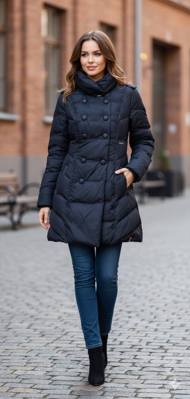 • التصميم المبطن (المنفوخ): يوفر الدفء الأمثل بفضل حشوة عالية الجودة، مع خياطات مائلة/متعرجة تمنح الجاكيت قوامًا أنثويًا رشيقًا بدلًا من المظهر المنتفخ التقليدي.