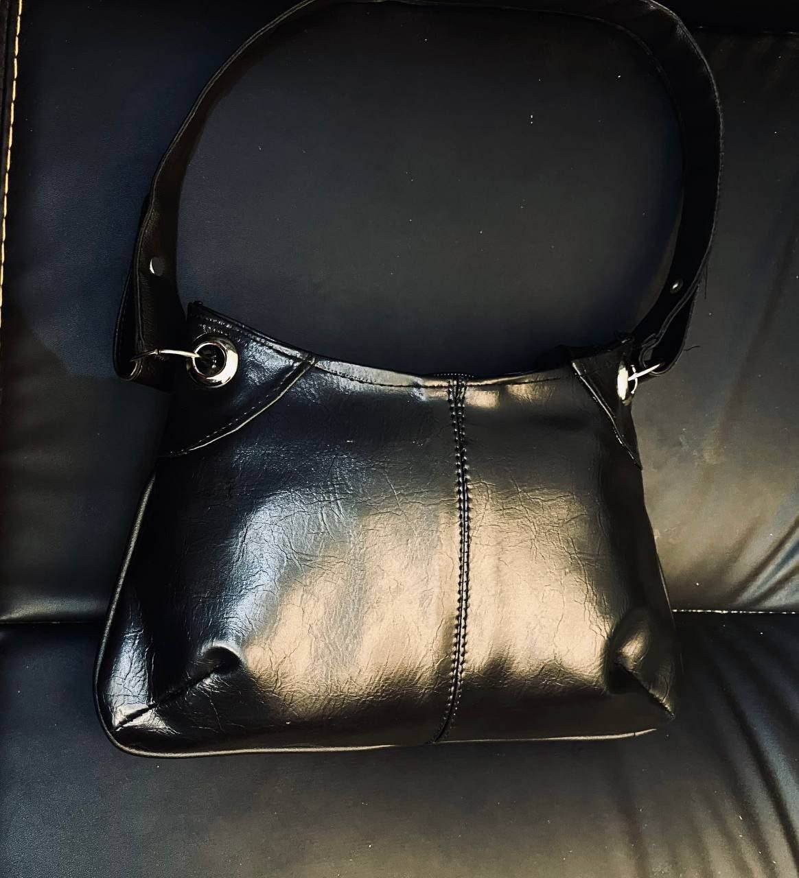 خامة لامعة وجذابة: الجلد الصناعي ذو اللمعة الخفيفة يلتقط الضوء ببراعة، مضيفاً لمسة من الرقي تجعل الحقيبة مناسبة للخروجات النهارية والمسائية على حد سواء.