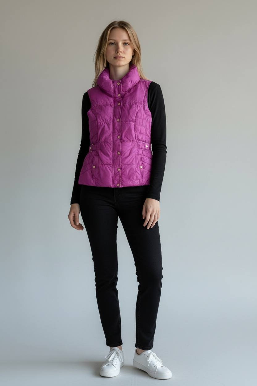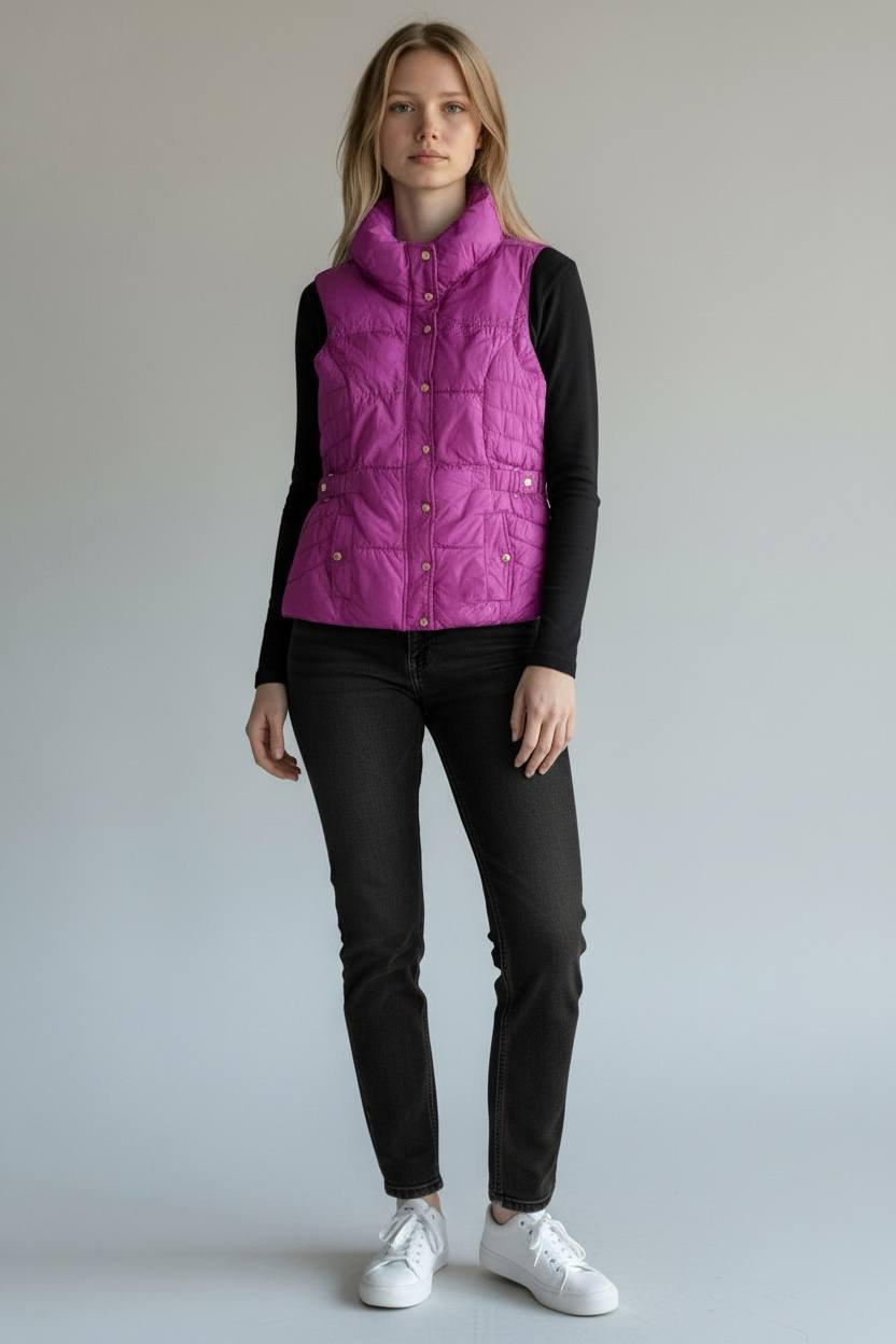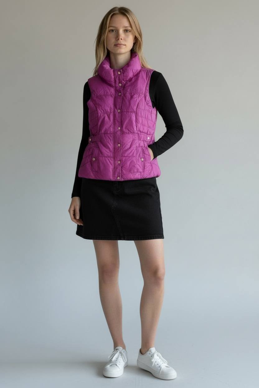 تألقي بأناقة عصرية لا مثيل لها مع هذه الصدرية المبطنة باللون الفوشيا/البنفسجي الزاهي والمشرق، المصممة خصيصًا لتمنحكِ الدفء والراحة دون التضحية بالستايل. هذا الفست هو الإضافة المثالية لخزانة ملابسكِ لموسم البرد!