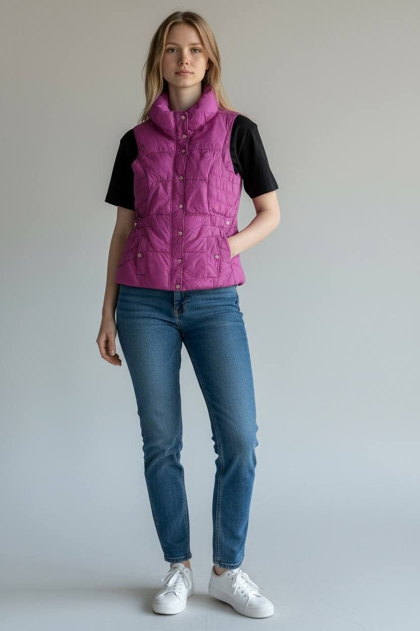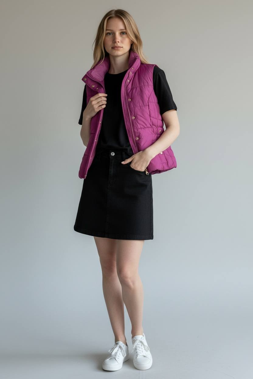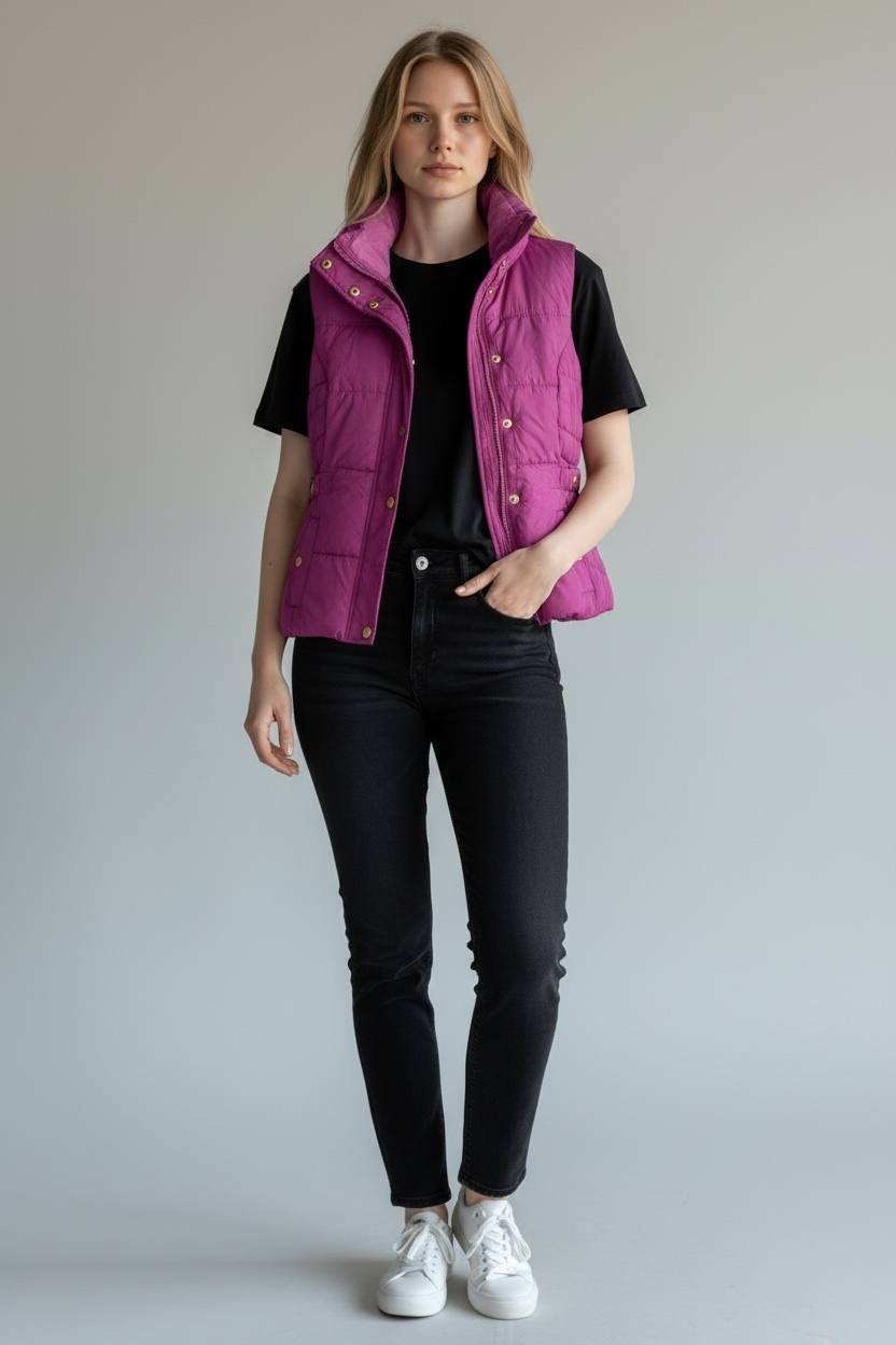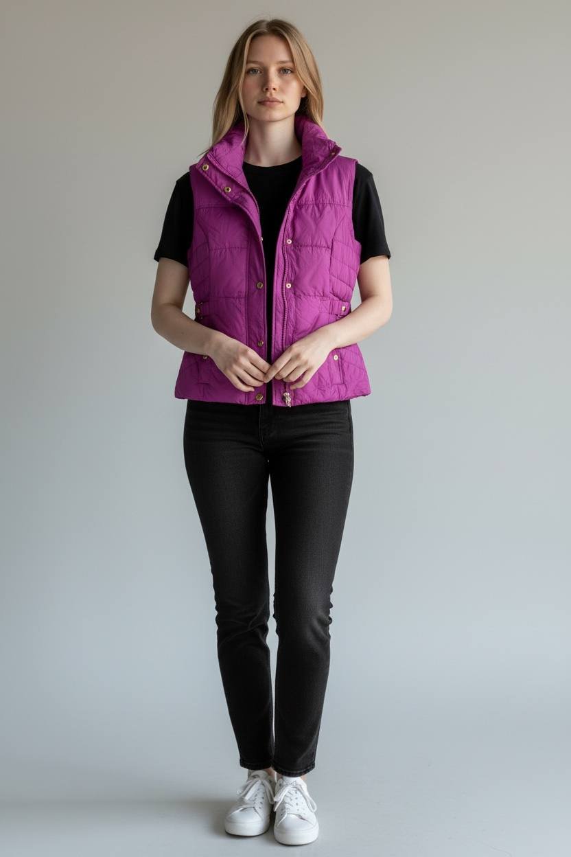 تألقي بأناقة عصرية لا مثيل لها مع هذه الصدرية المبطنة باللون الفوشيا/البنفسجي الزاهي والمشرق، المصممة خصيصًا لتمنحكِ الدفء والراحة دون التضحية بالستايل. هذا الفست هو الإضافة المثالية لخزانة ملابسكِ لموسم البرد!